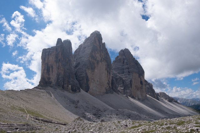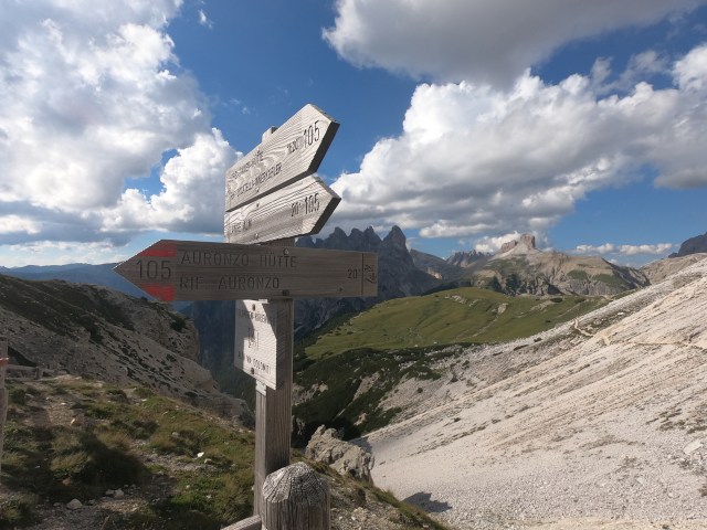 La gita classica consigliata anche per le famiglie è quella del giro delle Tre Cime. Si tratta di una gita abbastanza lunga ma facile che fa l’anello intorno alle Tre Cime rimanendo sempre in falsopiano e che passa per i tre rifugi sottostanti le Cime: il Rifugio Auronzo (2333m), dal quale parte il giro, il Rifugio Lavaredo (2344m) e il Rifugio Locatelli (2438m). Il sentiero è il 105, ma le indicazioni sono ovunque chiare ed è impossibile sbagliarsi!